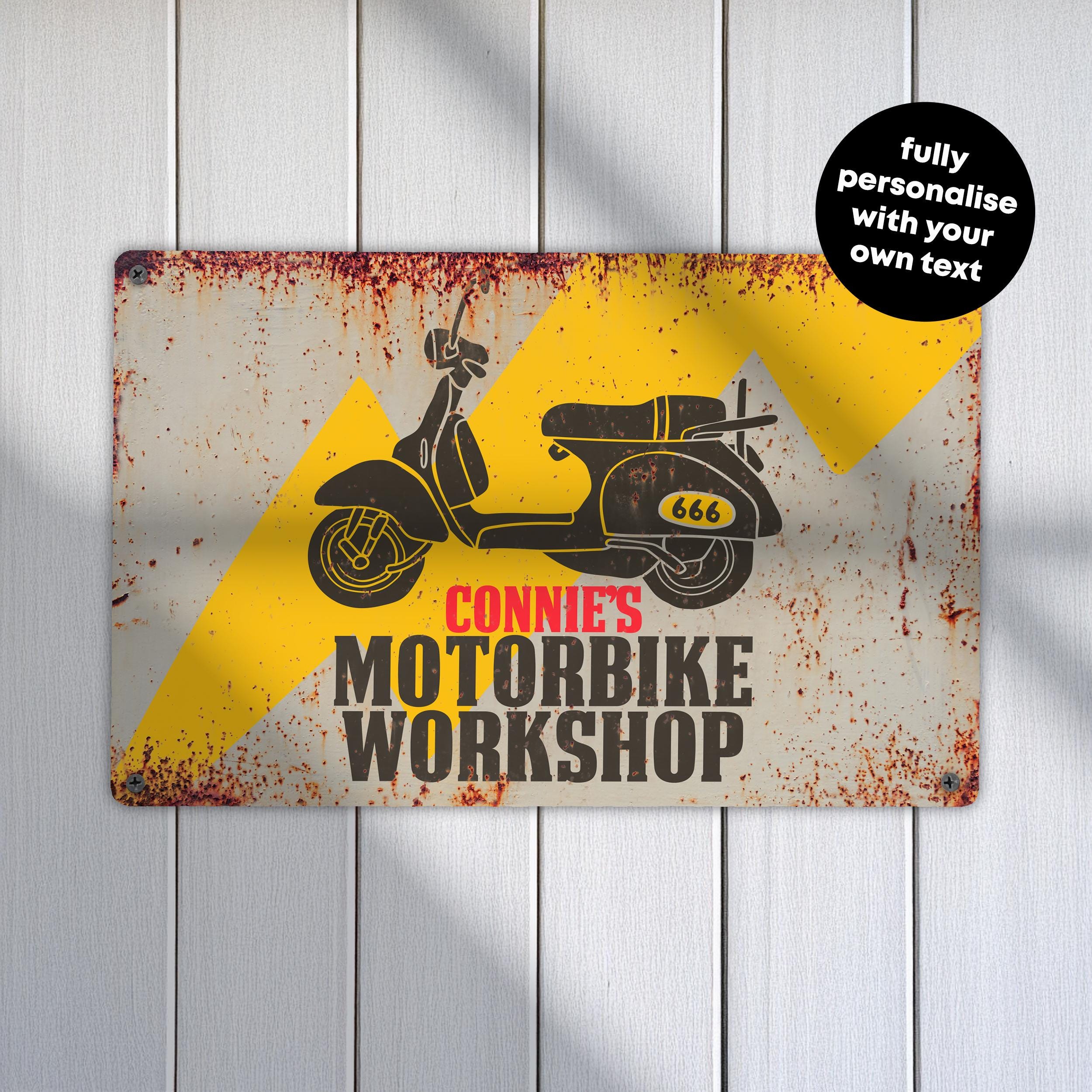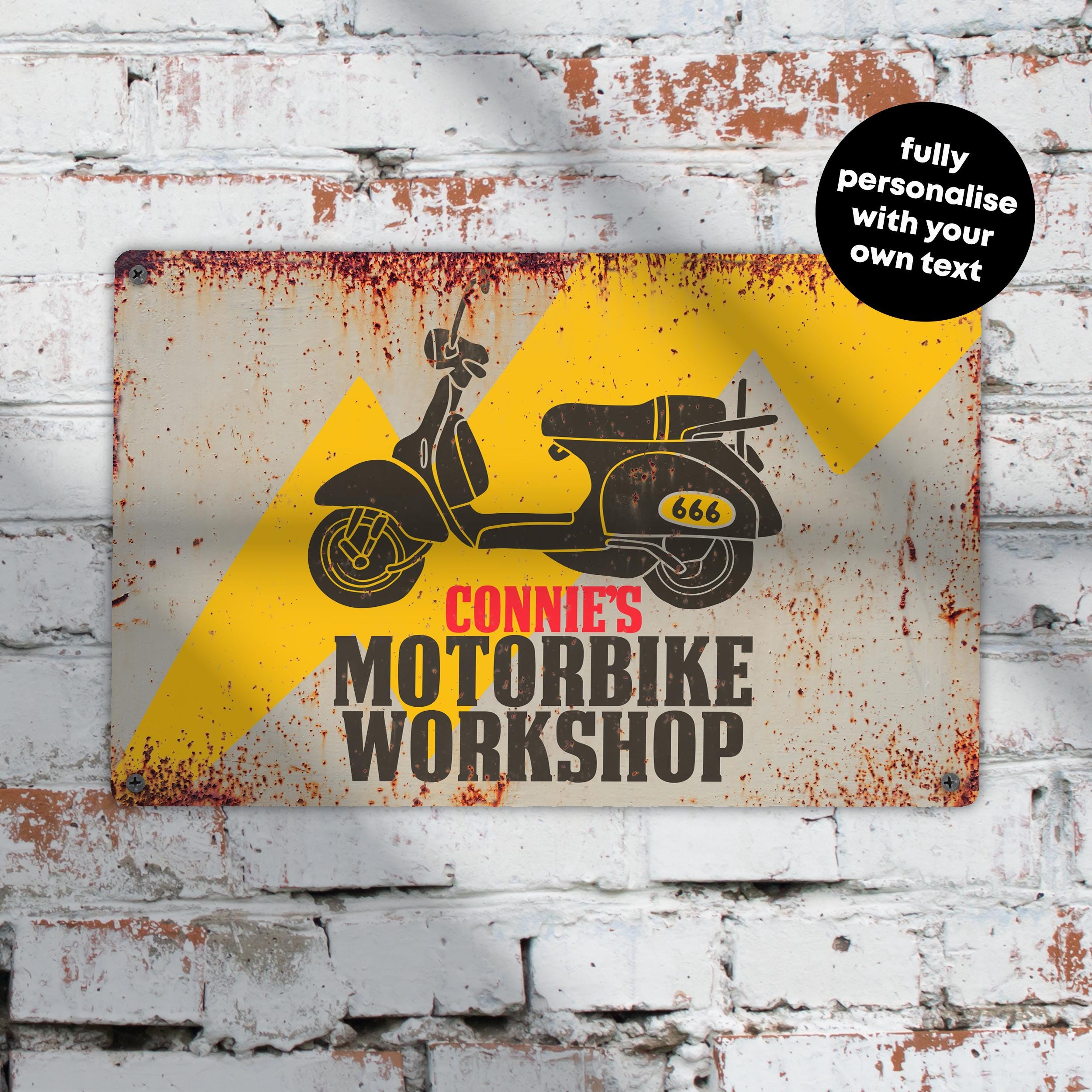 Classic Bike Restoration Sign Rustic Personalised Metal Biker Garage Wall Art