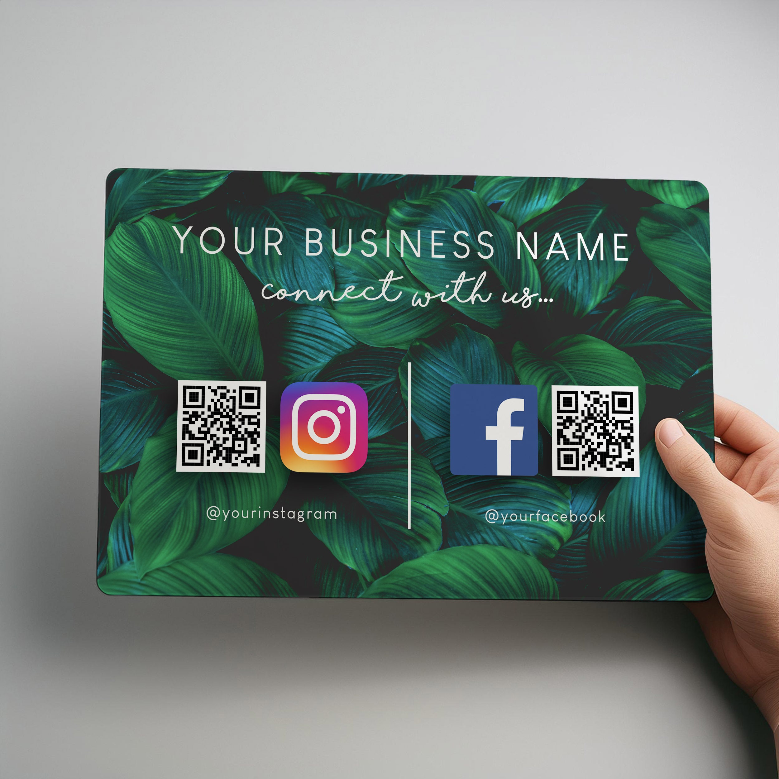 Boost your business visibility with this personalised social media sign featuring a scannable QR code for Facebook, Instagram, TikTok, Google, website links, or customer reviews – anything you like. Perfect for salons, boutiques, and small shops, this eye-catching display helps customers connect and follow your business instantly.
