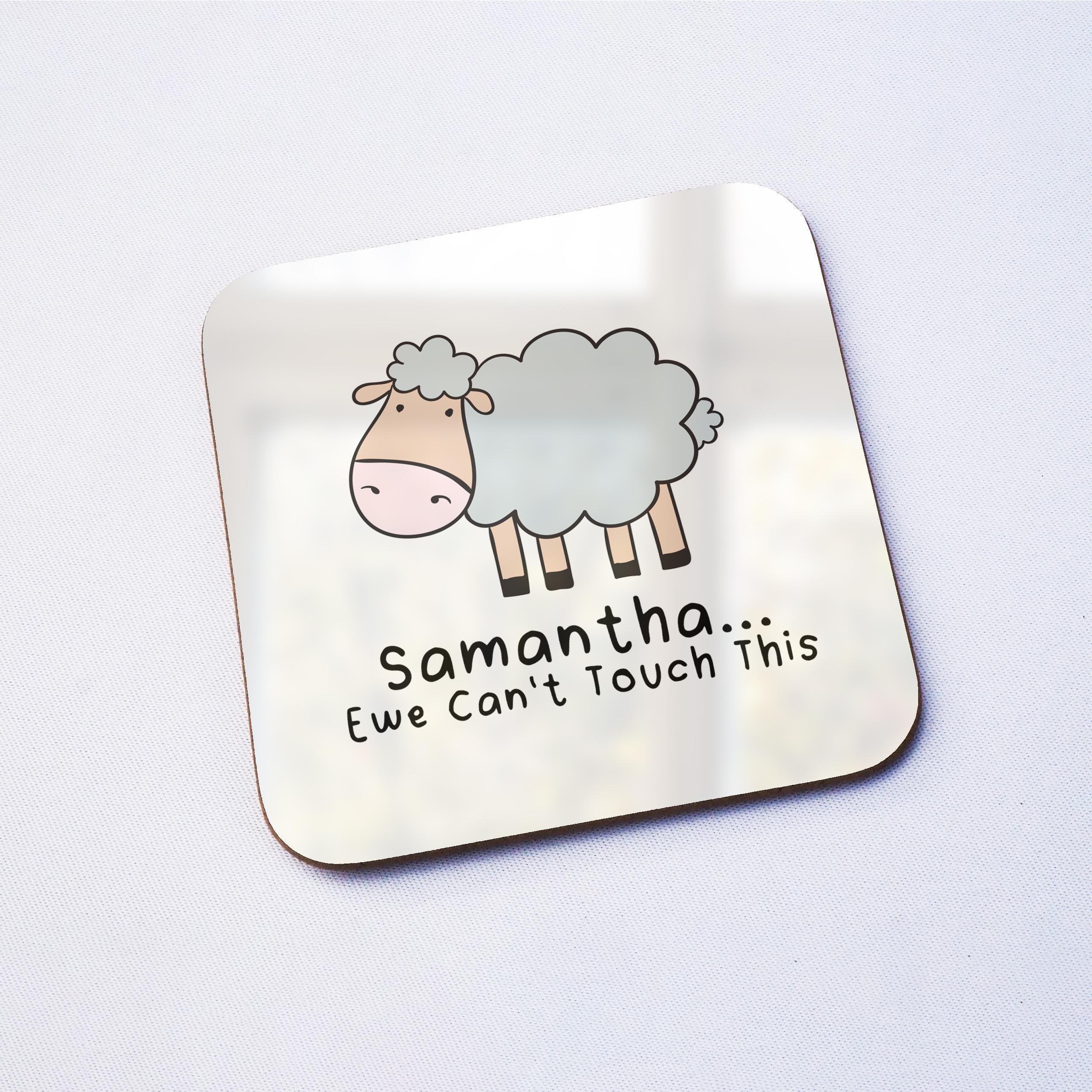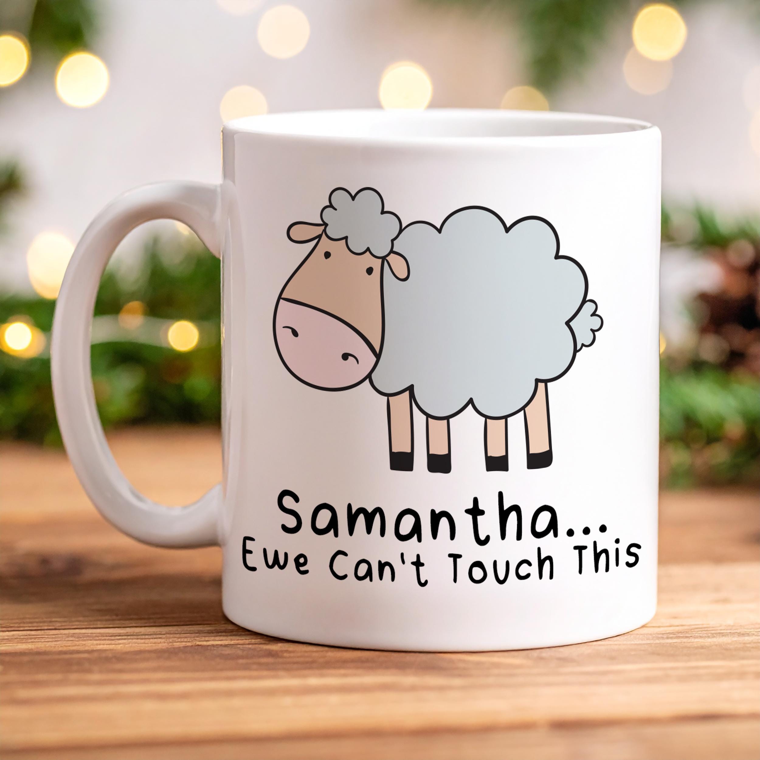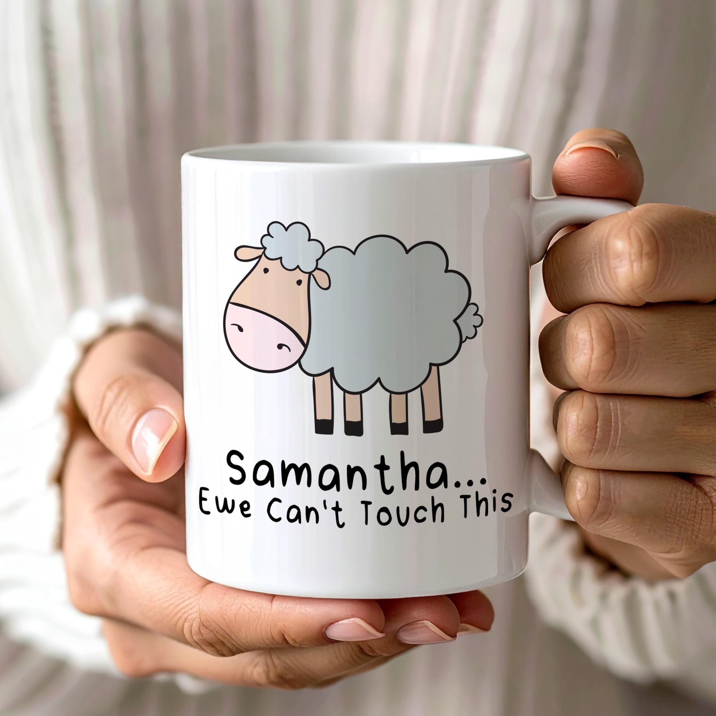 This personalised sheep mug features a cute cartoon sheep illustration with the funny pun “Ewe Can’t Touch This” and your chosen name. A light hearted custom gift idea for birthdays, Christmas or everyday use, this unique coffee cup is perfect for animal lovers who enjoy a good laugh with their brew.