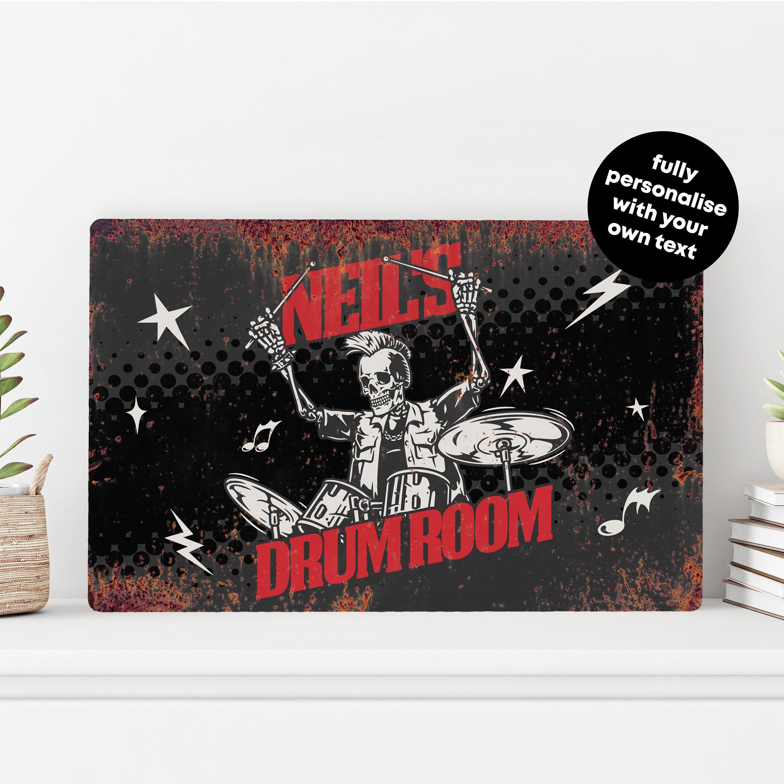 Bring energy to your practice space with this personalised drum room sign, custom printed on metal for music rooms, studios, and rehearsal spaces. A great gift idea for musicians and drum kit players, this wall sign makes a bold and personal addition to any drumming setup.