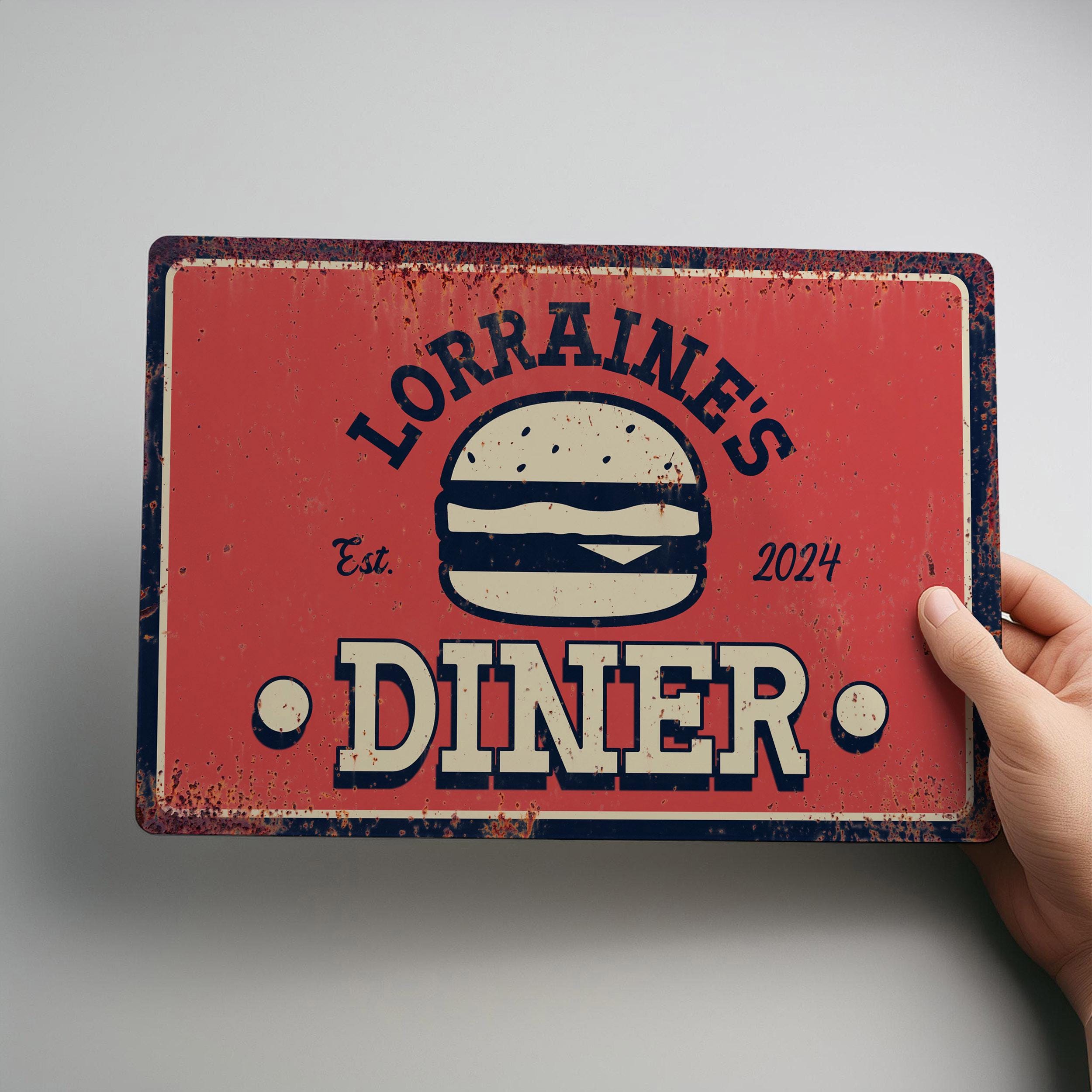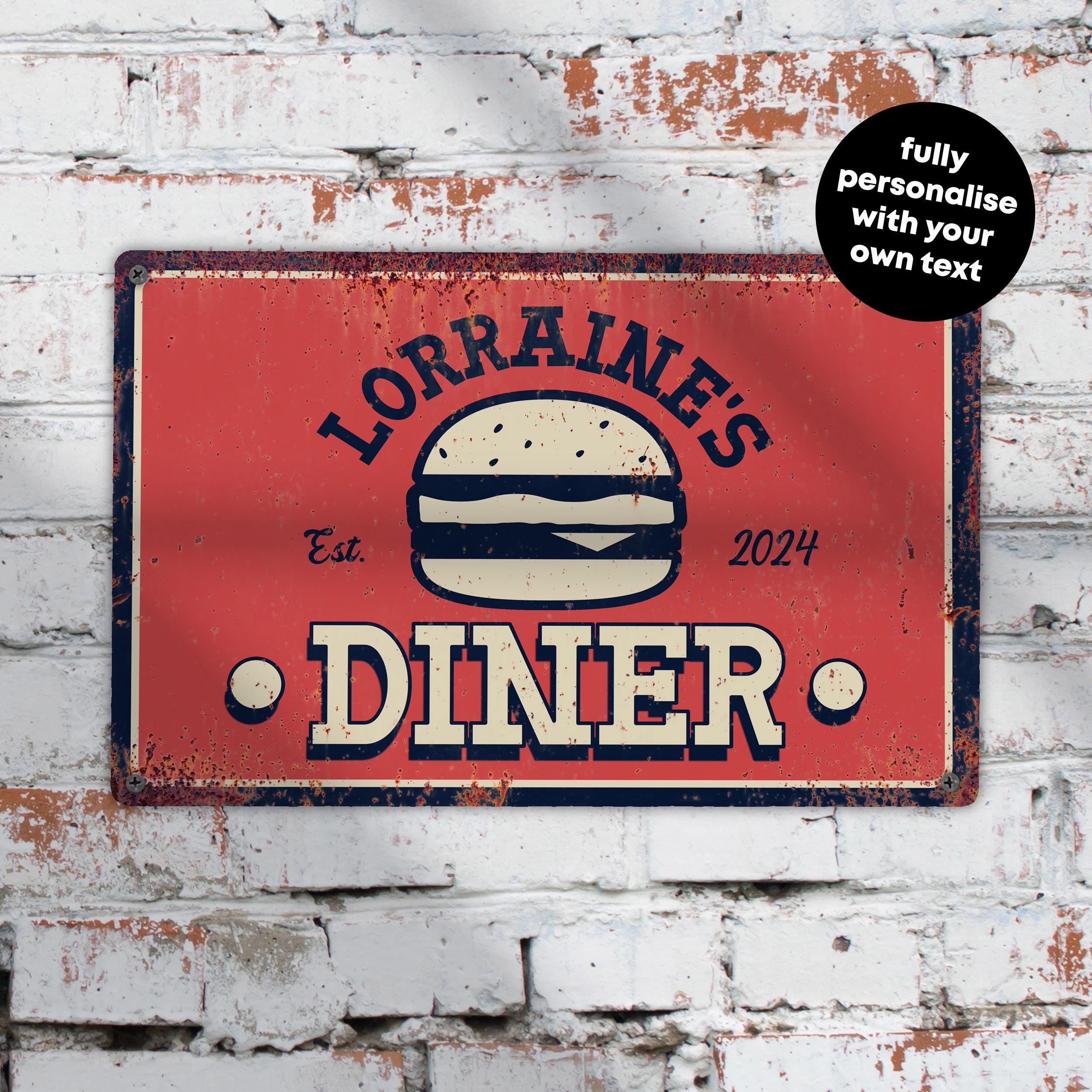 Add vintage flair to your kitchen or home bar with this Personalised Metal Retro Diner Sign. Inspired by classic American diners, this printed wall art makes a fantastic gift idea for food lovers and burger bar fans. Personalise it with your own name or slogan for a unique retro look.