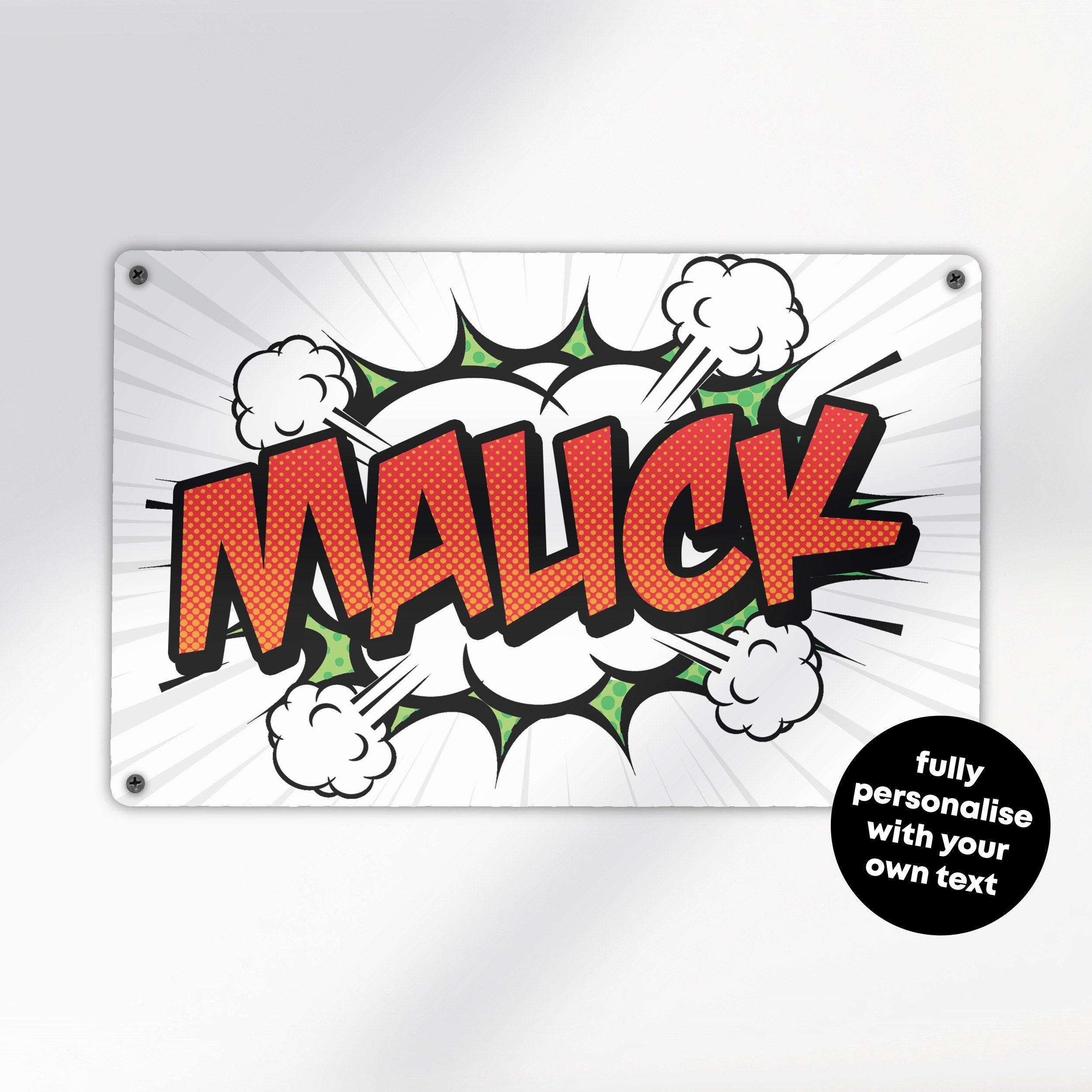 Unleash your inner hero with this personalised superhero sign printed on durable metal and styled with bold comic book flair This vibrant name plaque is perfect for kids bedrooms doors playrooms or superhero themed spaces A brilliant gift idea for comic lovers and young fans alike it can be customised with any name or phrase to make it truly super.