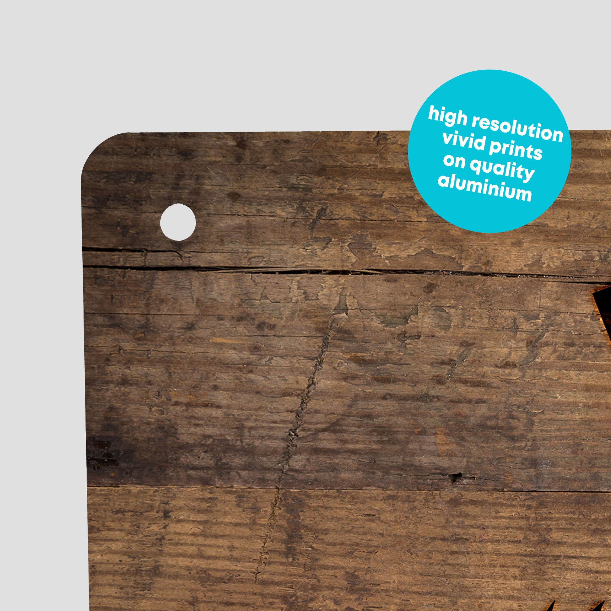 All of our signs are sublimation printed on aluminium which is approximately 0.5mm thick. Signs can be used indoors or outdoors but should be kept away from direct sunlight.
