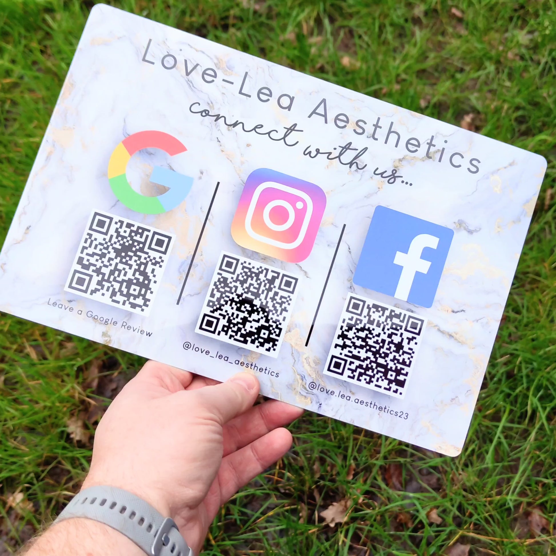 To create your sign we need your social media account details. Please copy and paste the full web address to your accounts and paste them in the personalisation box along with the business name and if you'd like the 'connect with us' text changing to something else.