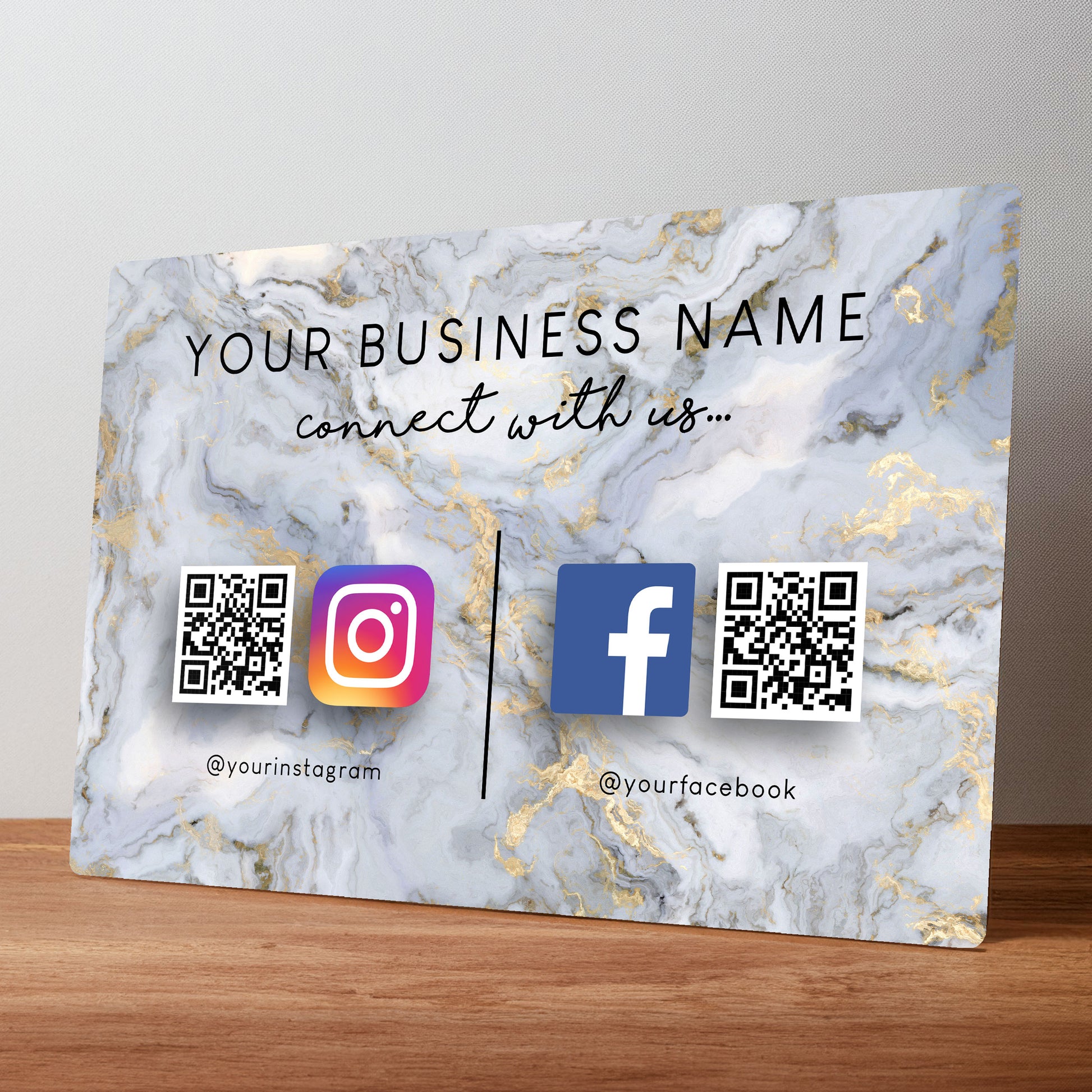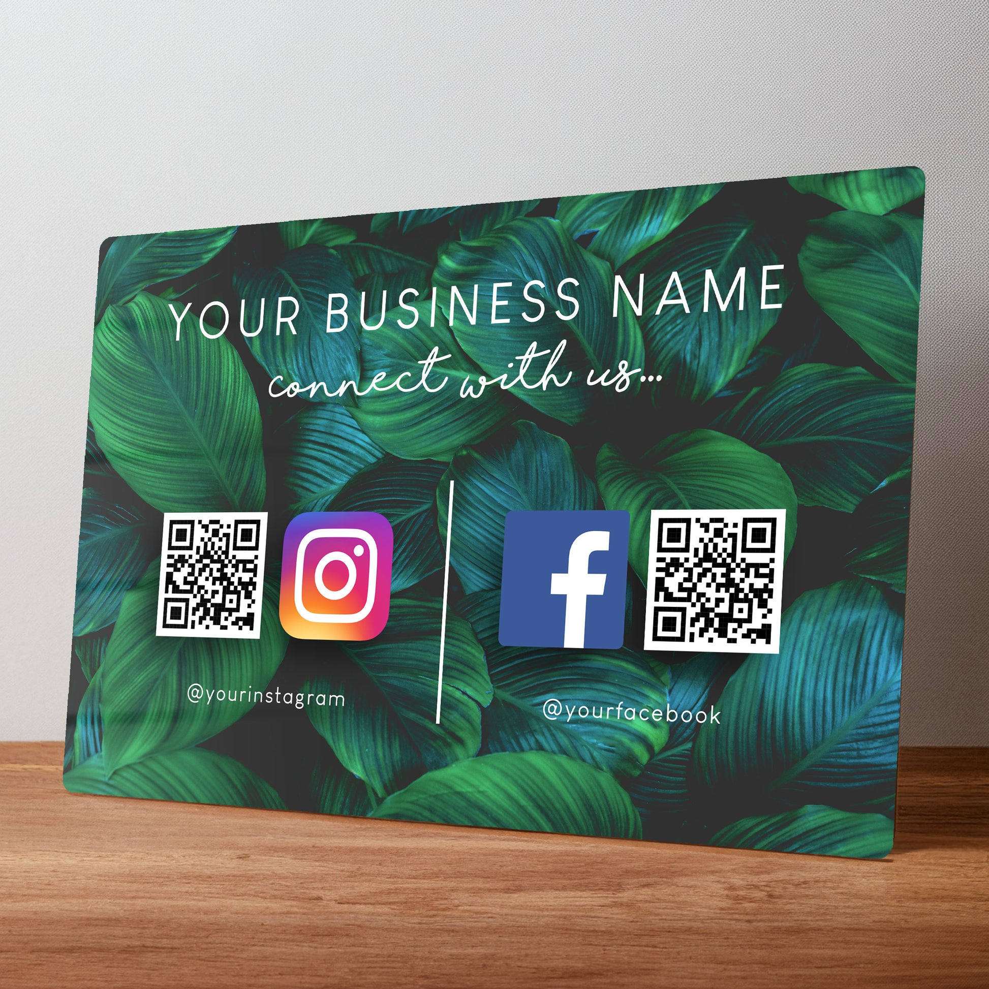 To create your sign we need your social media account details. Please copy and paste the full web address to your accounts and paste them in the personalisation box along with the business name and if you'd like the 'connect with us' text changing to something else.