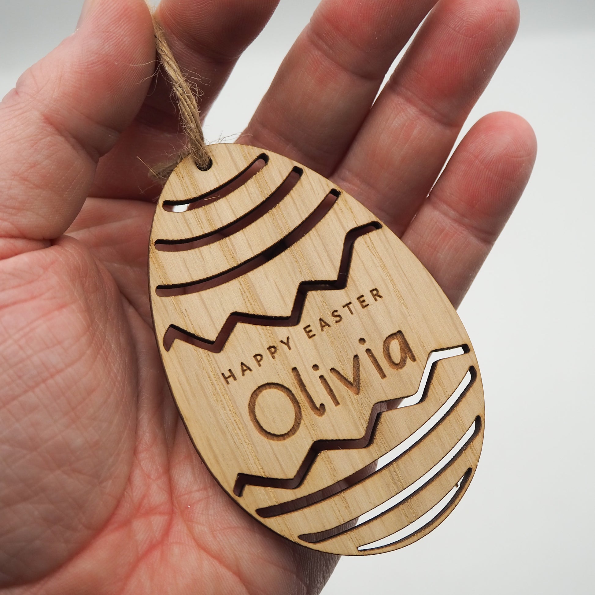 Celebrate Easter with this handmade laser engraved wooden hanging egg. Complete with rustic jute twine ready to hang.