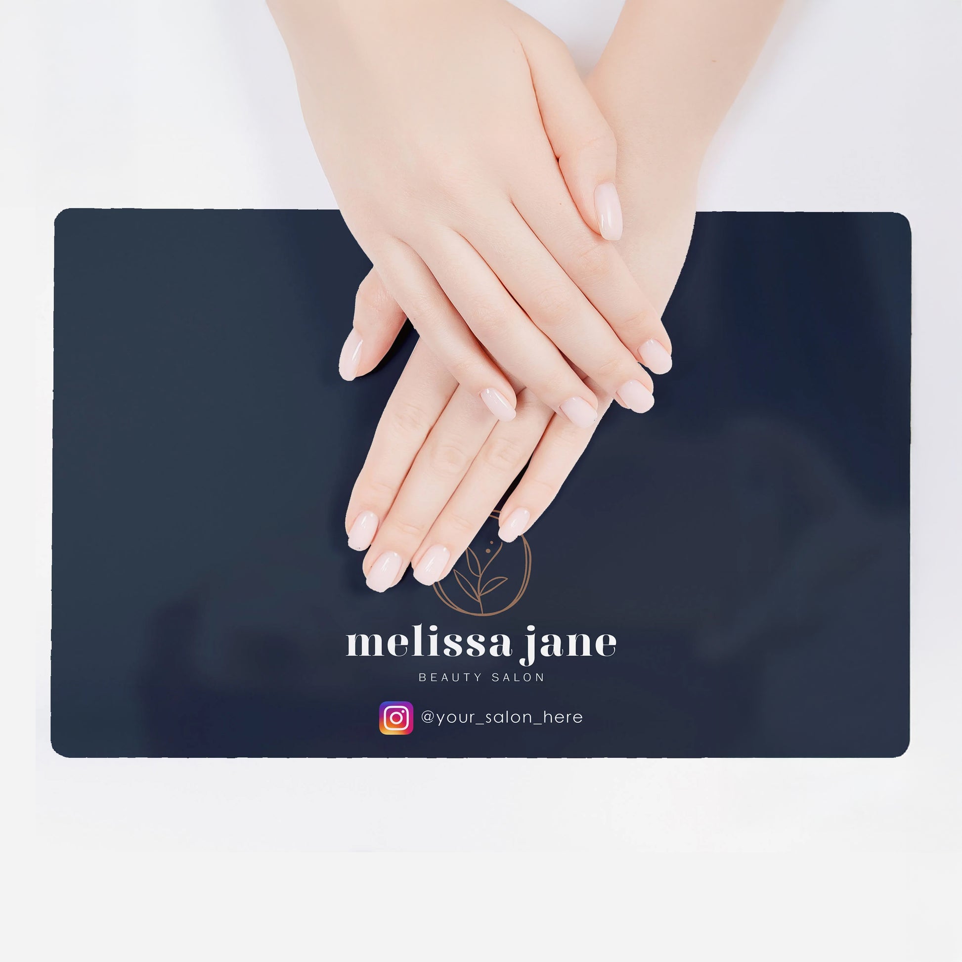 Our personalised nail salon mats are printed on glossy aluminium, making them the perfect backdrop for showcasing your work on social media. Designed to enhance your brand, these mats are durable, easy to clean with alcohol wipes or similar, and simple to store when not in use.