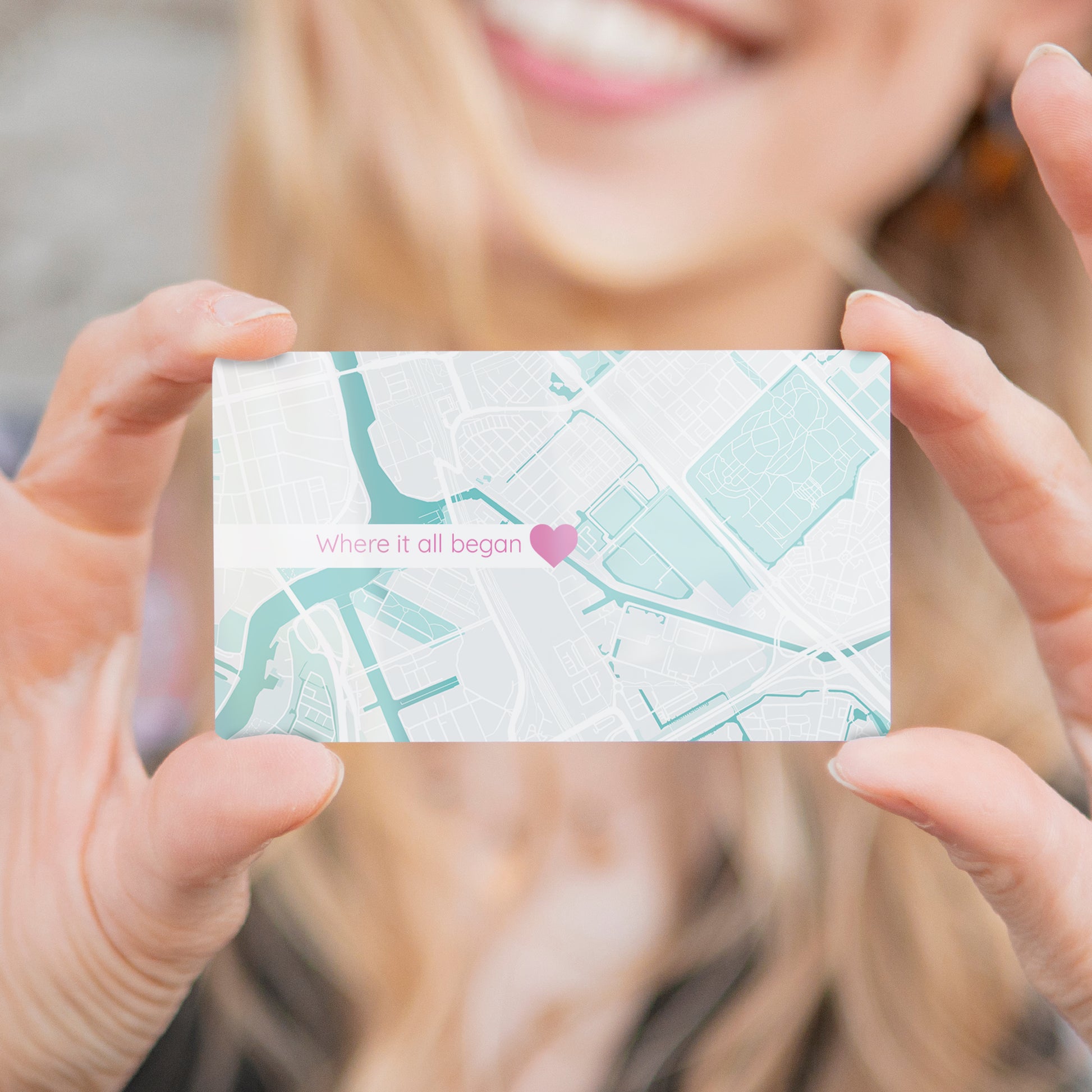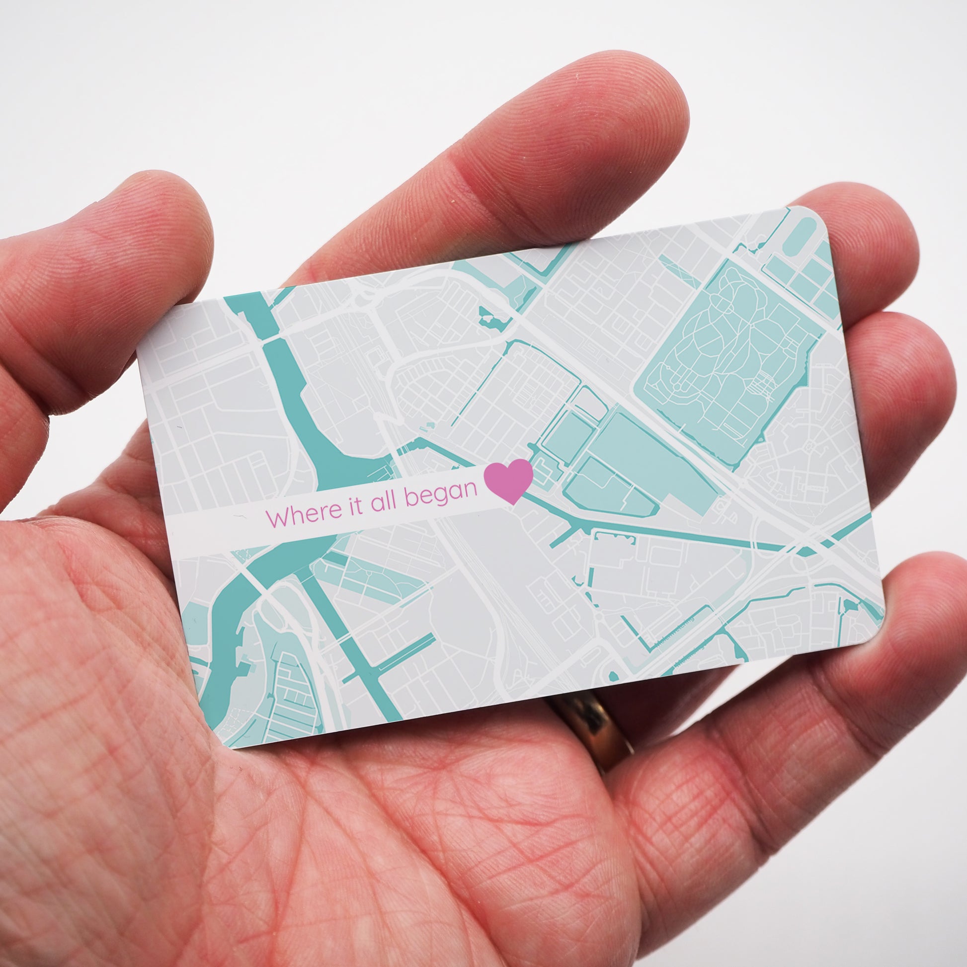 Wallet cards measure approximately 85x55mm, about the size of a standard business card. They're .5mm thick and are single sided printed with your map and message in high resolution on the face with a high gloss finish.