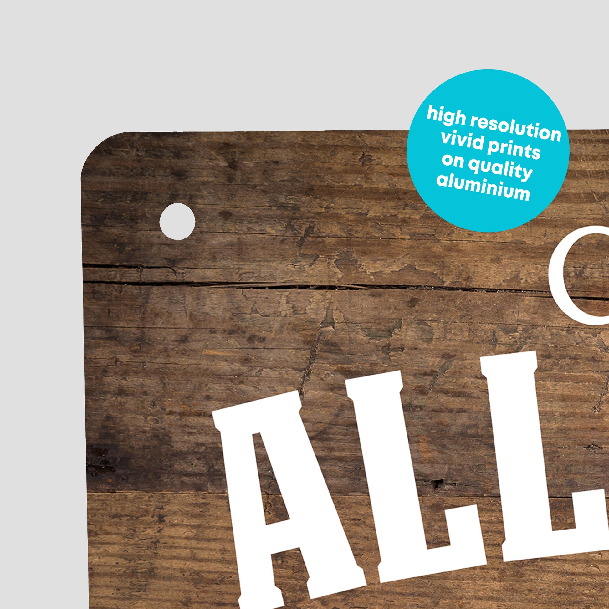 All of our signs are sublimation printed on aluminium which is approximately 0.5mm thick. Signs can be used indoors or outdoors but should be kept away from direct sunlight.