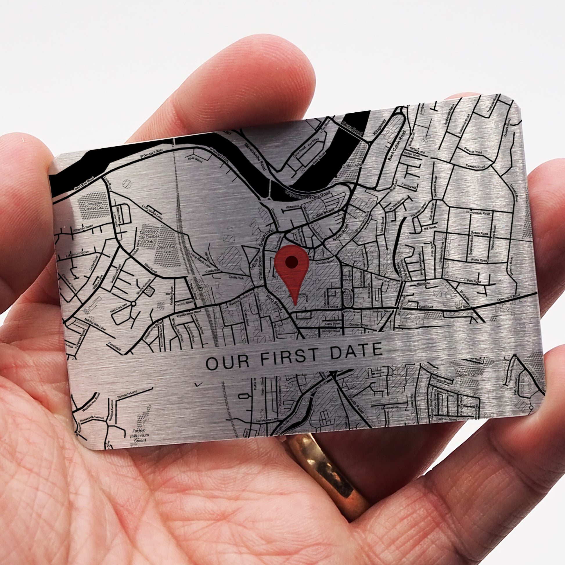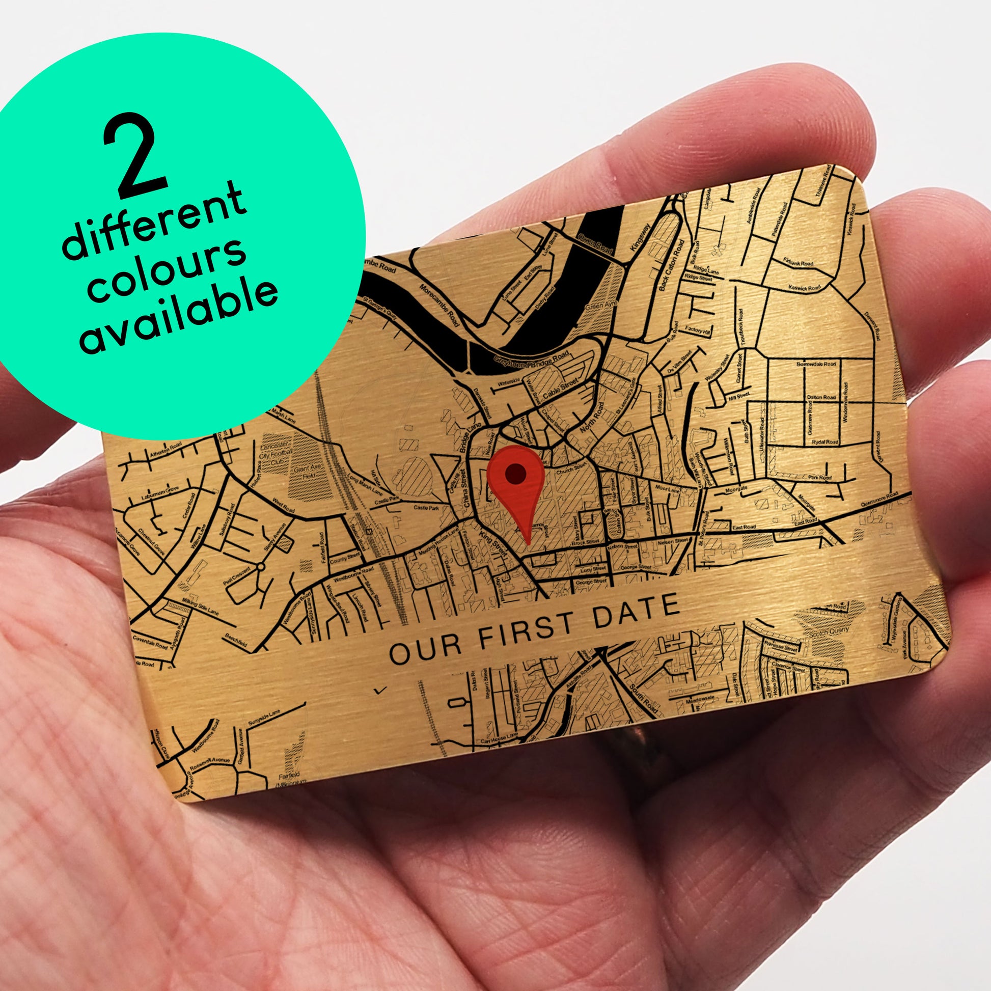 Our map cards are made from aluminium and have a brushed silver or gold coating.